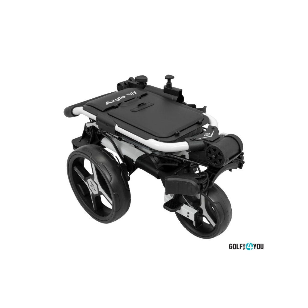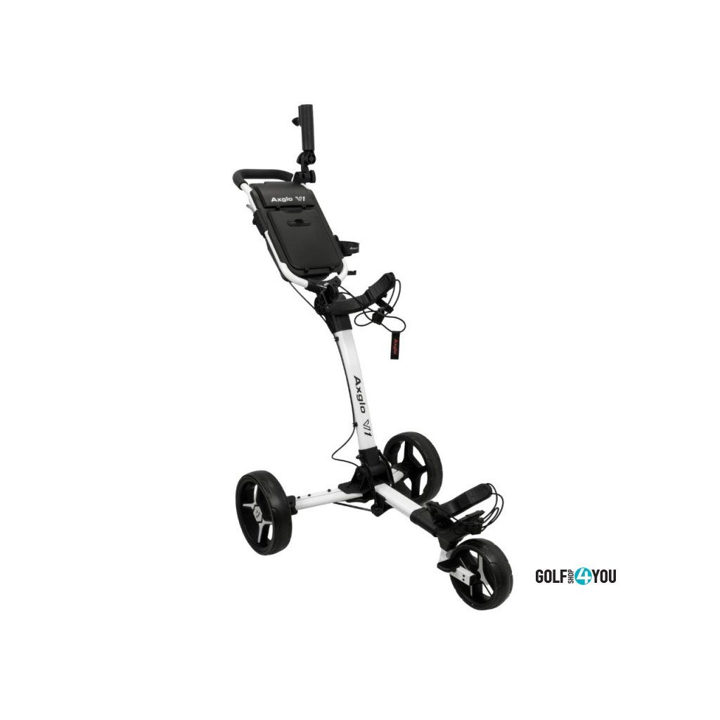 AXGLO Golfový Ruční Tříkolový Vozík V1, Bílá je lehký, stabilní a kompaktní golfový vozík s patentovaným skládáním v jednom kroku. Elegantní bílé provedení doplňuje praktickou funkčnost – snadná manipulace, rychlé složení a přehledné uspořádání vybavení pro maximální komfort na hřišti.